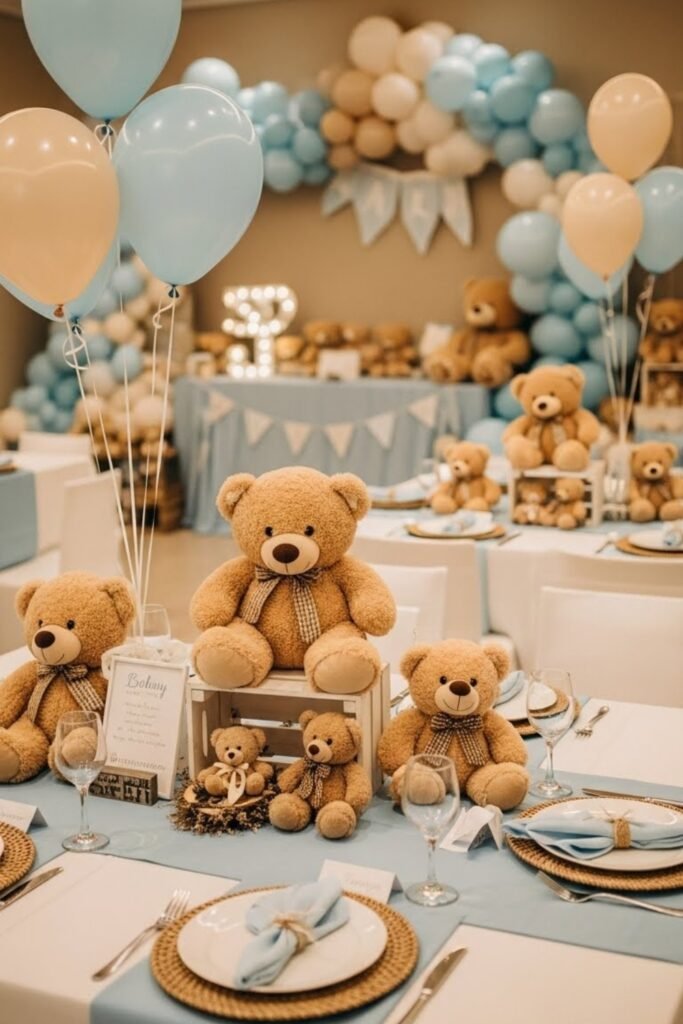 A teddy bear theme [Check on Amazon] brings a soft, cozy vibe perfect for a baby boy shower. Use plush bears as table decor, neutral blue tones, and warm textures.