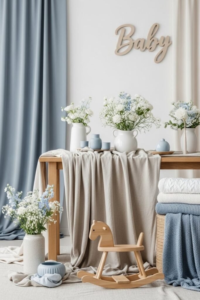 This idea works well for smaller gatherings and feels modern, cozy, and less formal while still celebrating the baby boy beautifully.