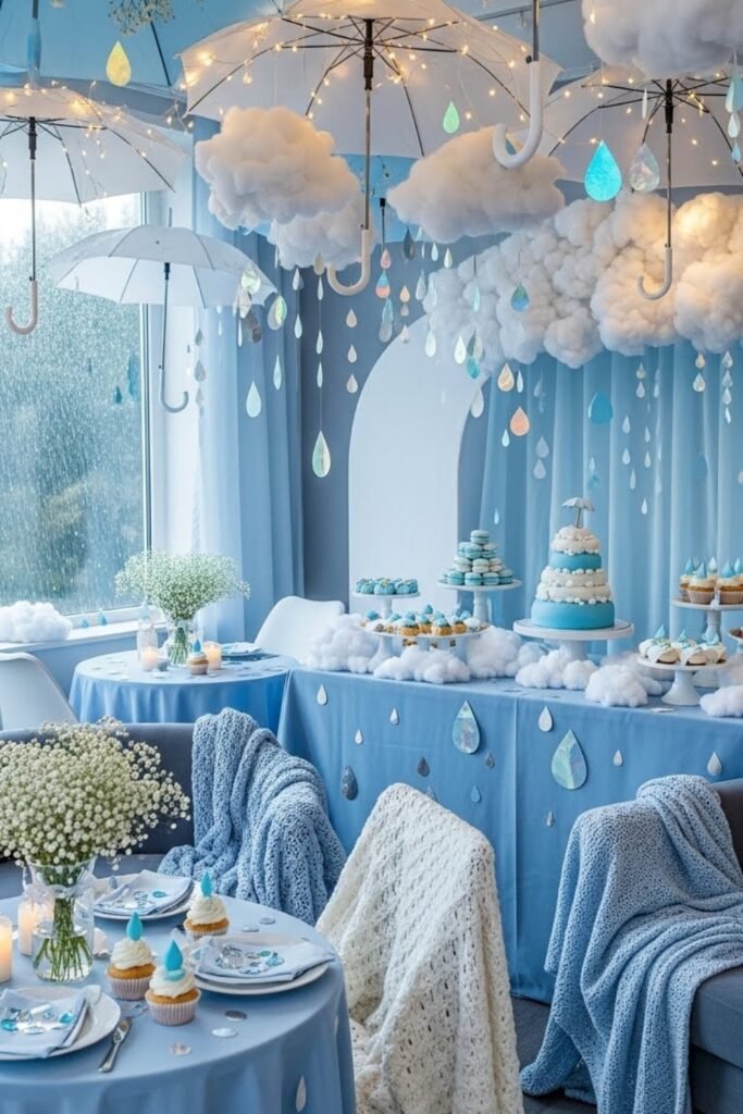A rainy day theme [Check on Amazon] features umbrellas, raindrop decor, and soft blue accents. Use cloud cutouts, light balloons, and gentle patterns to create a cozy atmosphere.