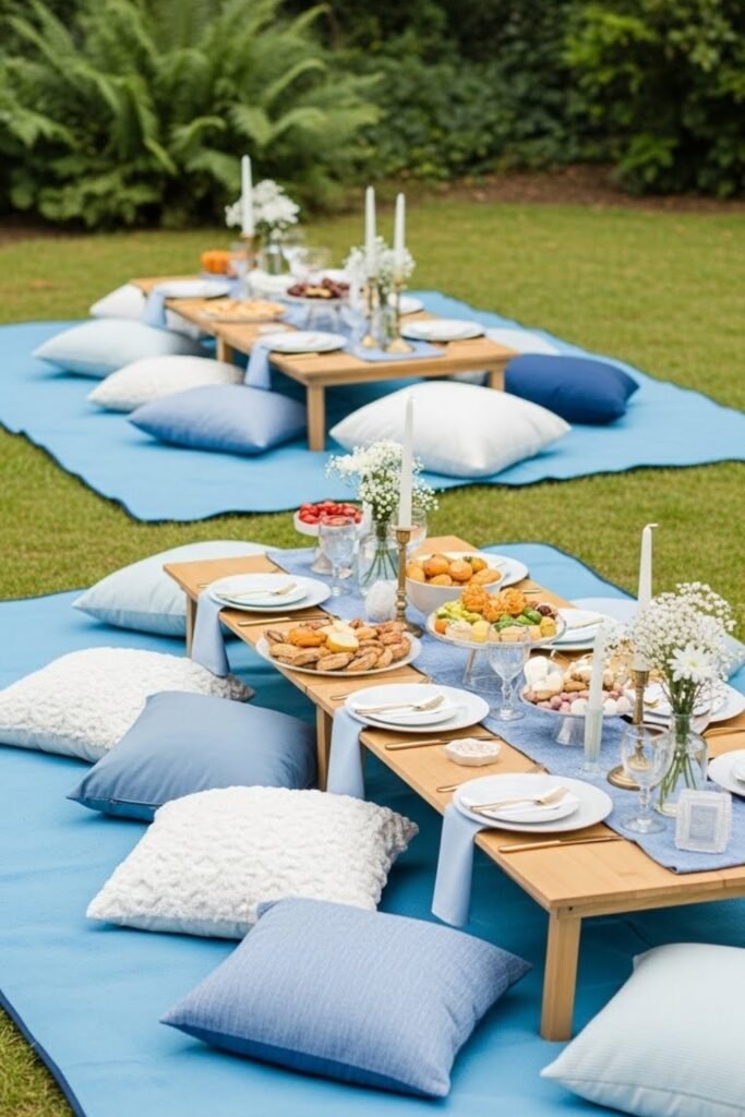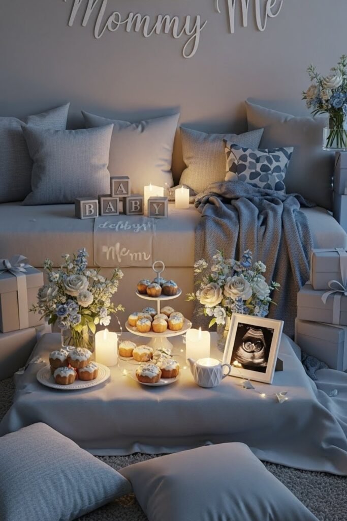 Plan a casual picnic-style baby shower using soft blue blankets, low tables, [Check on Amazon] and simple outdoor decor. Add baskets, fresh flowers, and light snacks to create a relaxed setting.
