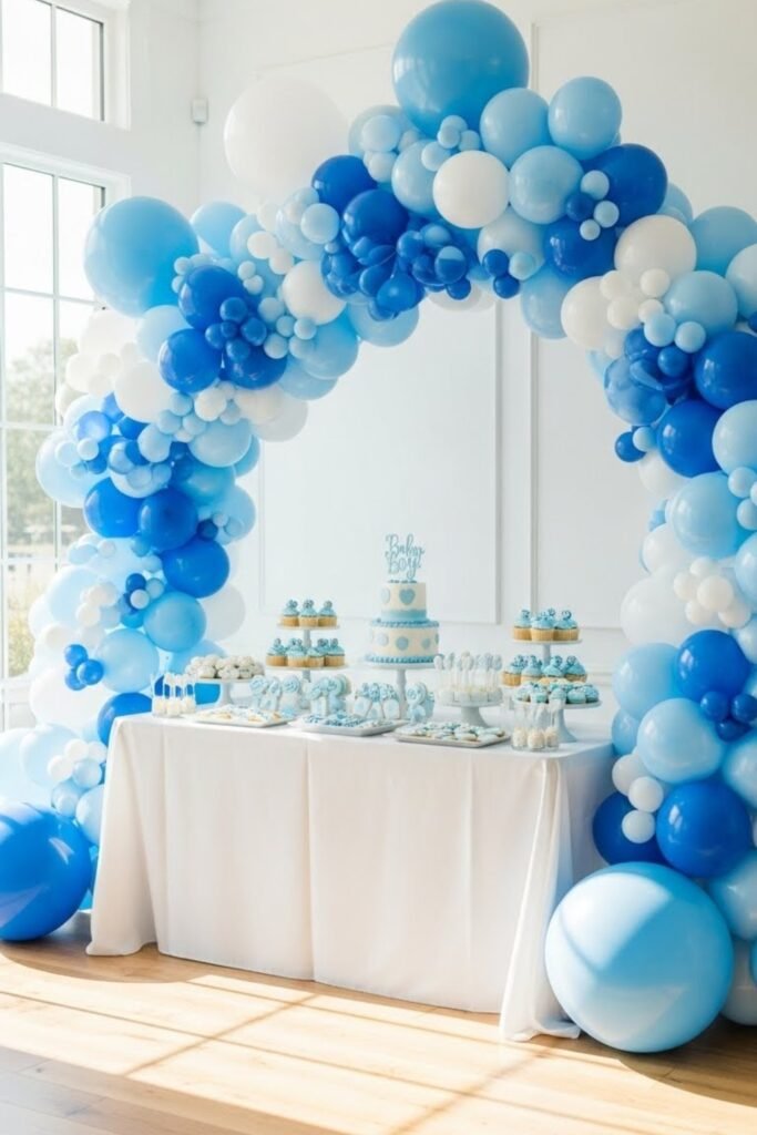 A balloon arch setup instantly elevates the baby shower space. Use different shades of blue mixed with white or transparent balloons.