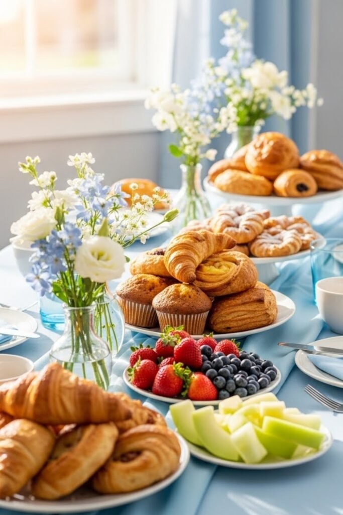 Host a relaxed daytime baby shower with a brunch-style setup. Use light blue accents, simple florals, and a casual food spread like pastries, fruit, and juice stations.