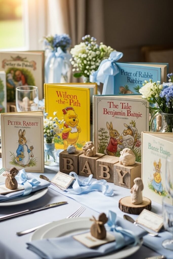 A storybook baby shower [Check on Amazon] uses classic children’s books as decor inspiration. Display open books, illustrated prints, and soft blue details across tables and backdrops.