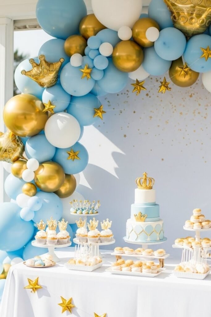 Add subtle touches like mini crowns on cupcakes and gold-rimmed plates to keep the theme classy yet playful for a baby boy celebration.