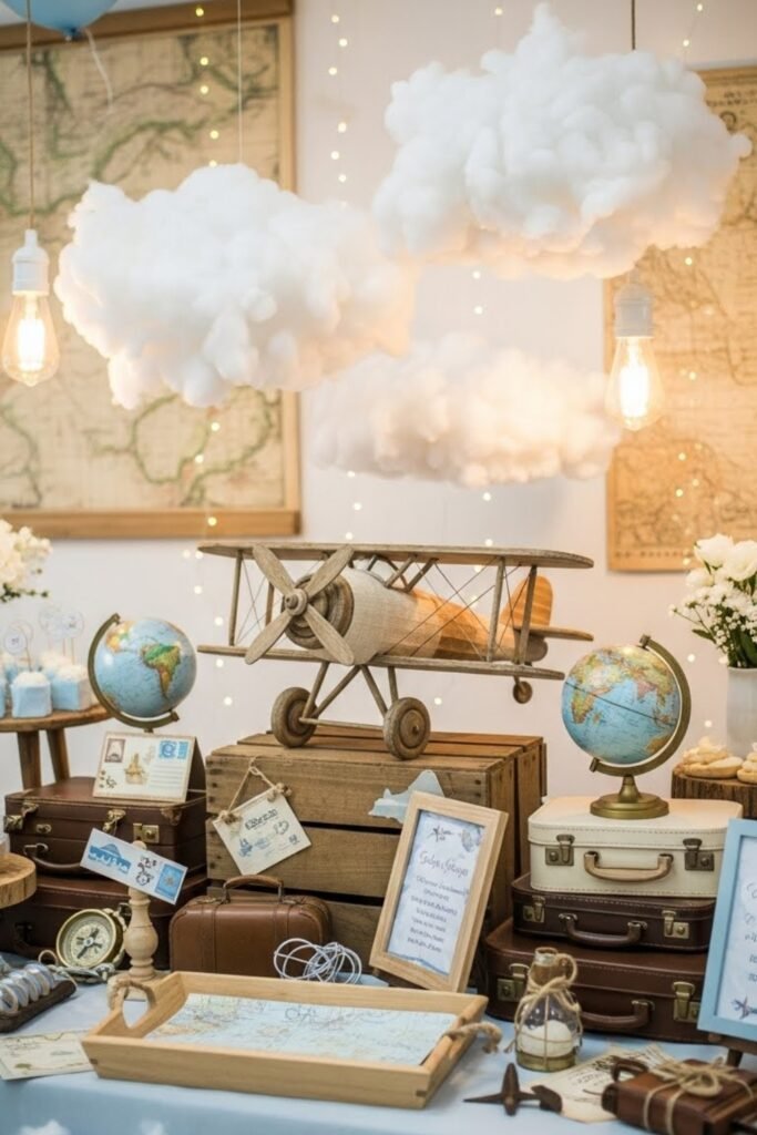 This theme features soft blues, clouds, and airplane accents for a nostalgic baby boy shower. Use wooden details, travel-style signage, and airplane motifs [Check on Amazon] on cakes or banners.