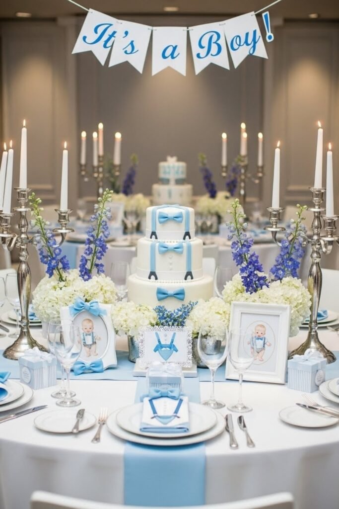 This theme uses bow ties, suspenders, and soft blue tones for a classy baby boy shower. Decorate with tailored details, simple signage, and elegant table setups.