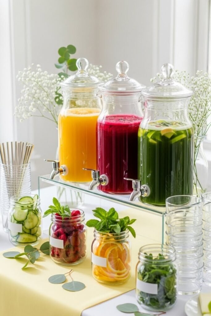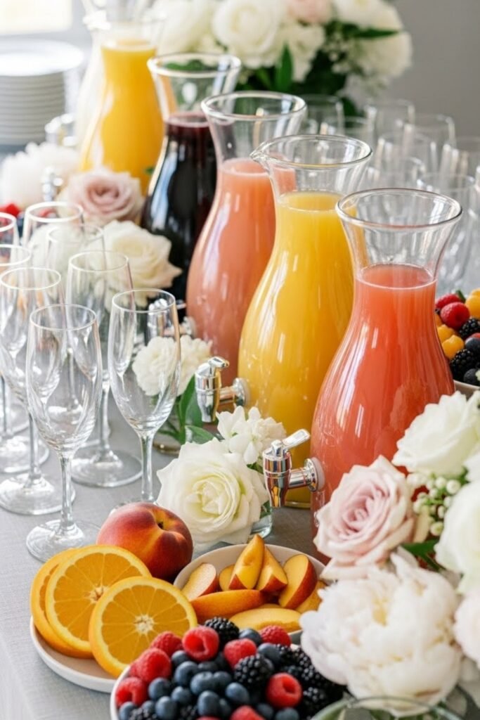 Set up a non-alcoholic mimosa station using fresh juices such as orange, peach, and mixed berries. Add clear glasses, fruit garnishes, and a small sign to elevate the display.