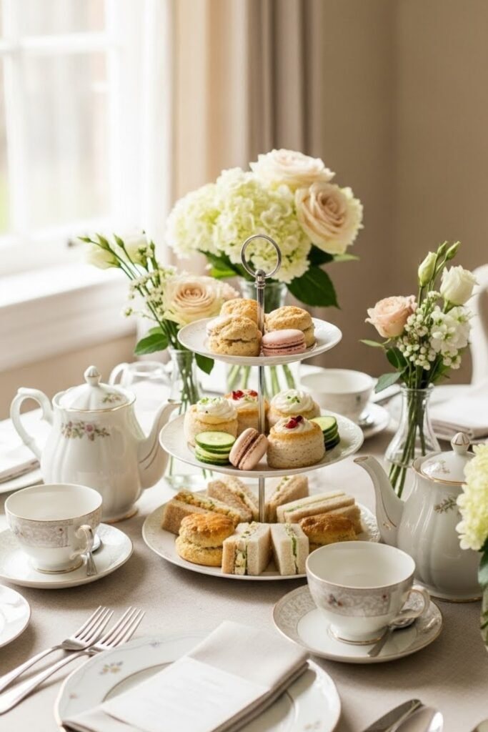 Blend a brunch menu with a tea-inspired setup using teapots, cups, and soft décor. Offer light foods like scones, finger sandwiches, and pastries.
