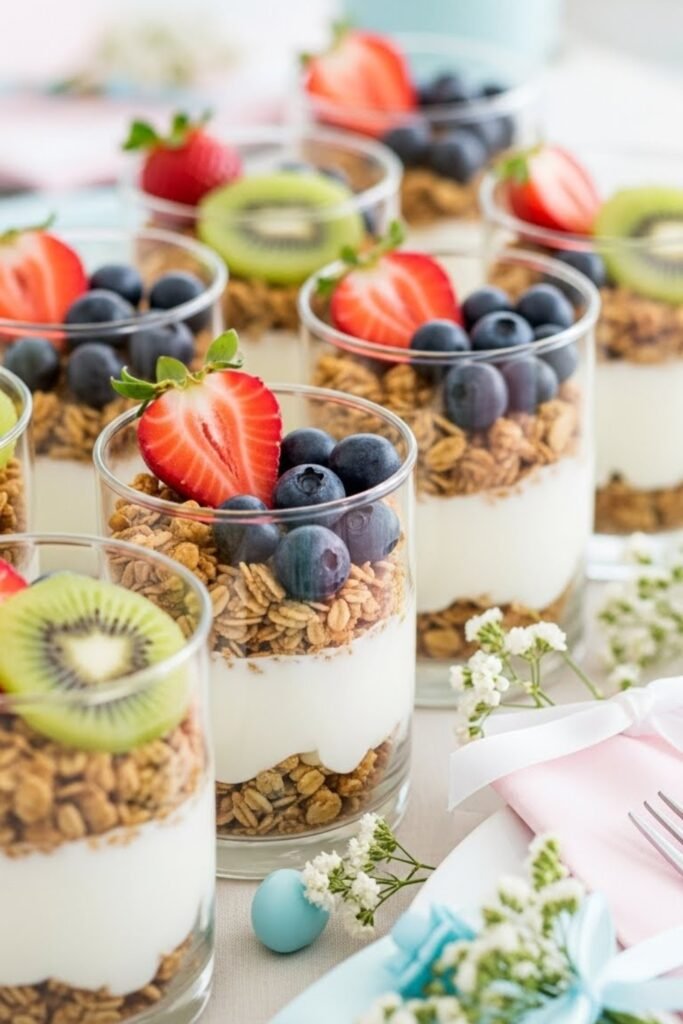Serve individual yogurt parfait cups layered with granola and fresh fruit. Use clear cups or jars so the layers show beautifully. This idea is simple, healthy, and easy to prep ahead.
