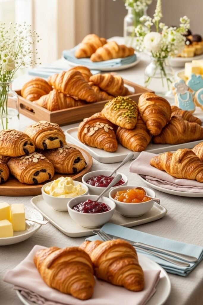 The soft, flaky pastries are easy for guests to grab and enjoy without utensils. It works well for both elegant and casual baby shower setups.