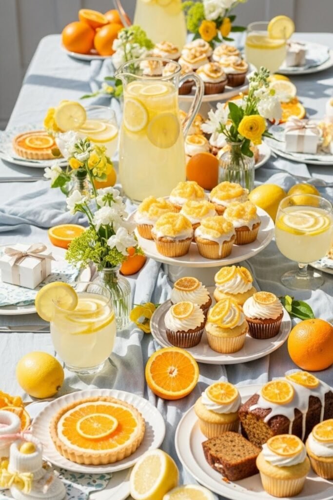 Use lemons, oranges, and soft yellow accents to brighten the brunch table. Pair the décor with citrus-based foods and drinks like lemon pastries and fresh juices.