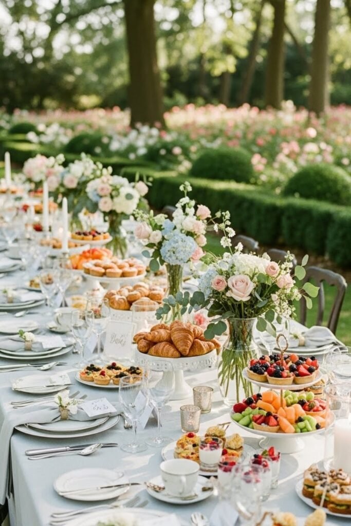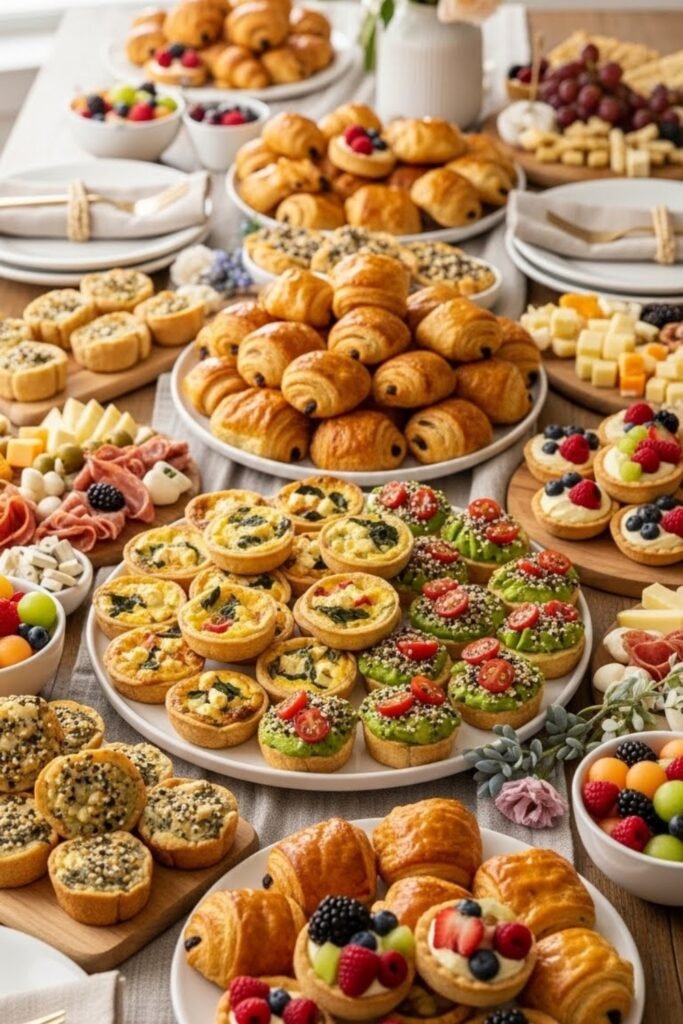 Offer small brunch bites such as mini quiches, toast squares, and bite-sized pastries. This idea keeps things neat and guest-friendly, especially for mingling.