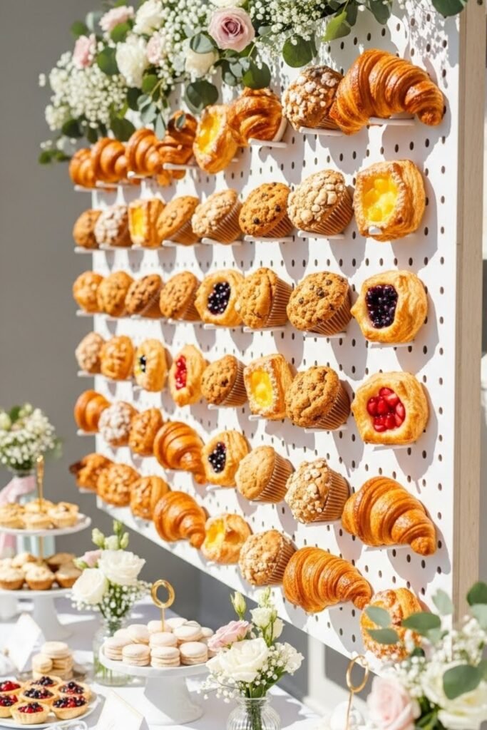 Display croissants, muffins, and danishes on a vertical pastry wall or tiered stand. This idea saves table space while creating a standout brunch feature.