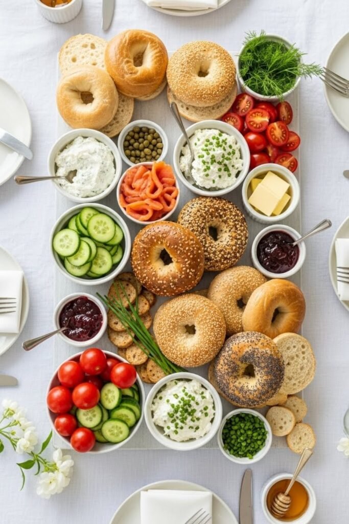 Create a large bagel board with sliced bagels, cream cheeses, smoked salmon alternatives, cucumbers, tomatoes, and fresh herbs.