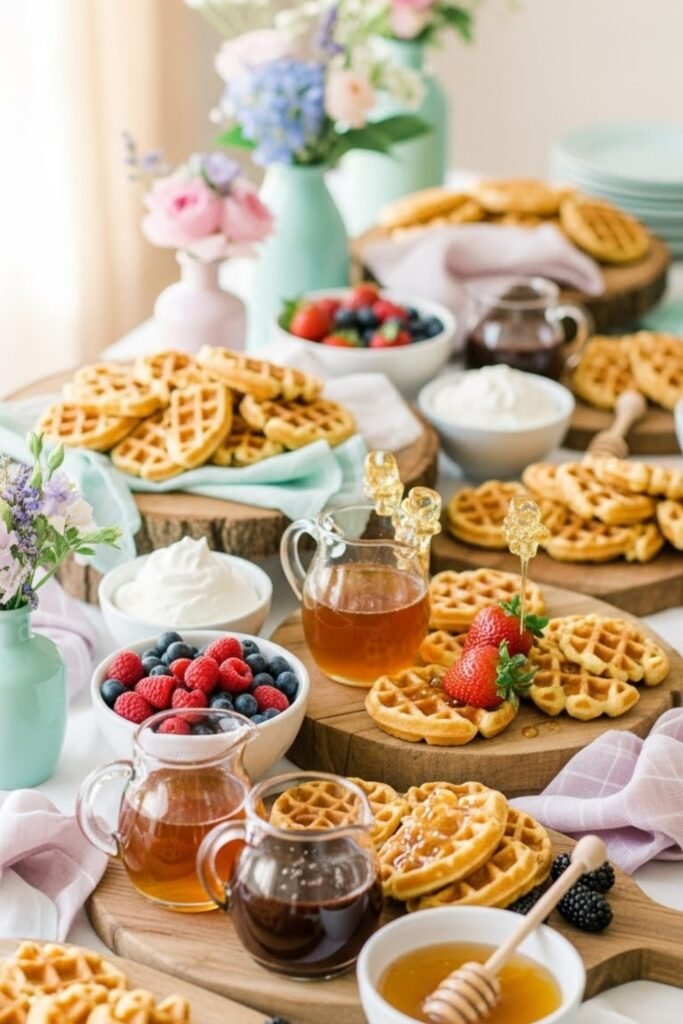 Create a self-serve waffle bar with mini waffles and sweet toppings like berries, honey, whipped cream, and chocolate drizzle.