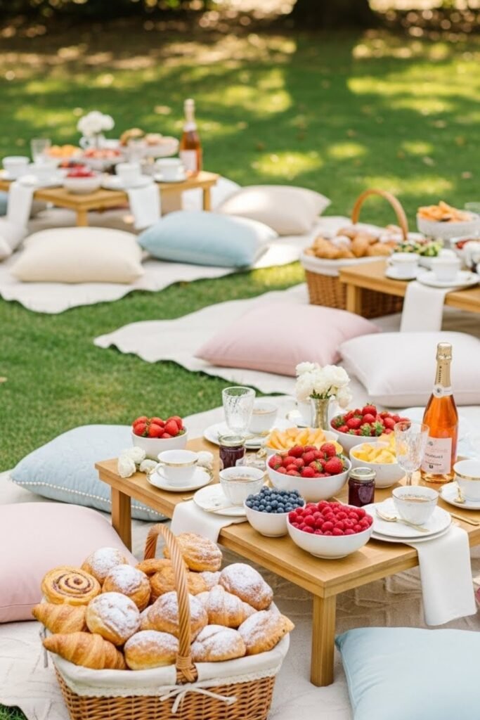 Host the baby shower as a casual brunch picnic using blankets, low tables, and baskets. Serve easy-to-eat brunch foods like pastries, fruit cups, and sandwiches.