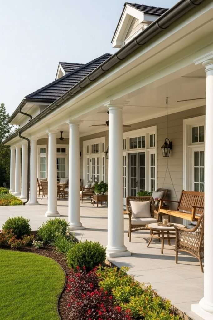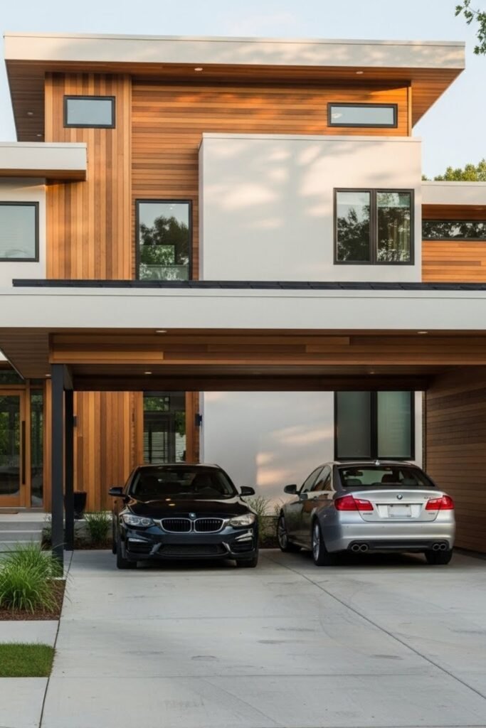This keeps the design balanced and protects vehicles from weather. A well-planned porch can double as a shaded sitting area or transition space at the entrance