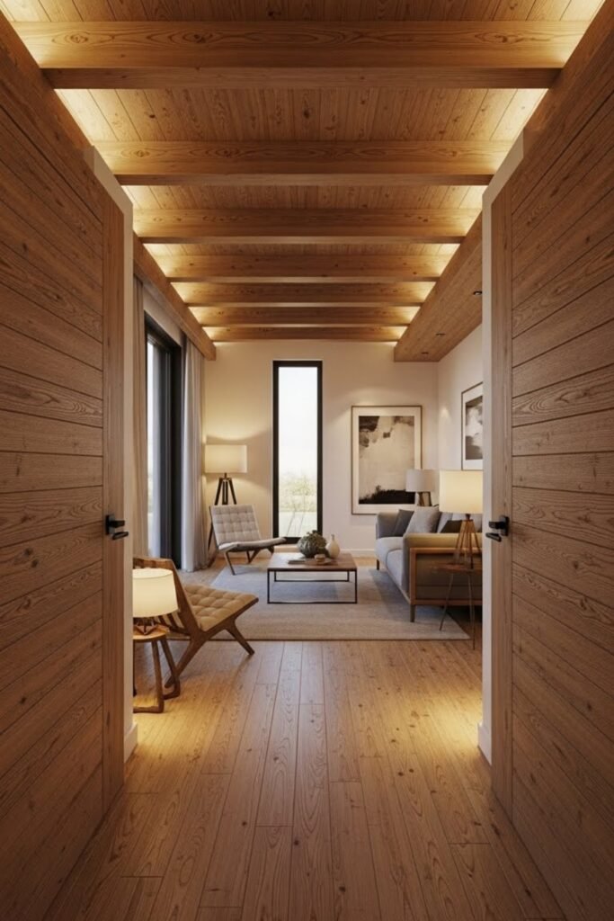 Add wooden beams, ceilings, or doors to introduce warmth and texture into the bungalow. Wood accents balance modern layouts with a cozy, natural feel.