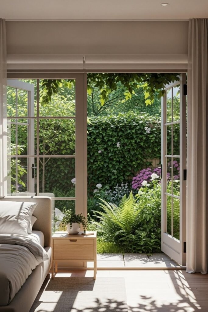 Large windows or doors opening toward greenery also allow better airflow and natural light while keeping the rooms calm and peaceful.