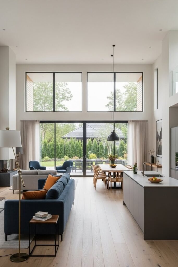 An open spine layout connects the living room, dining area, and kitchen in one long open zone. This removes unnecessary walls and helps light travel across the house.