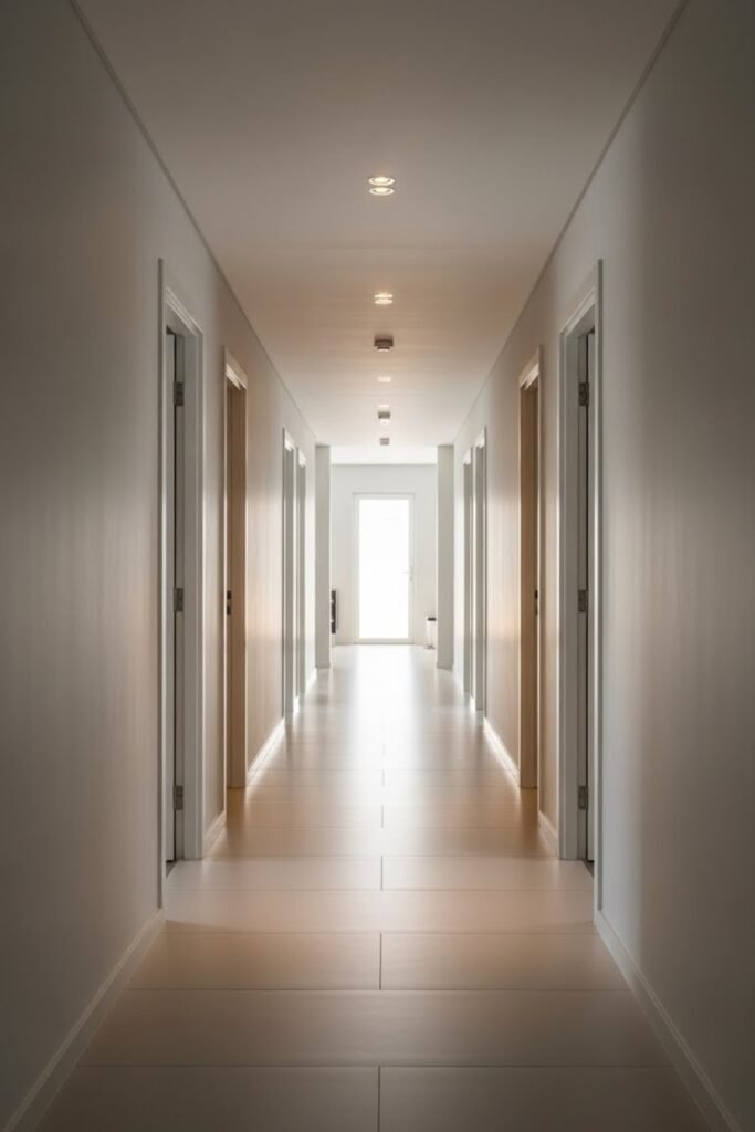 Use a single straight corridor to connect all rooms efficiently. This layout reduces wasted space and makes movement simple and clear.