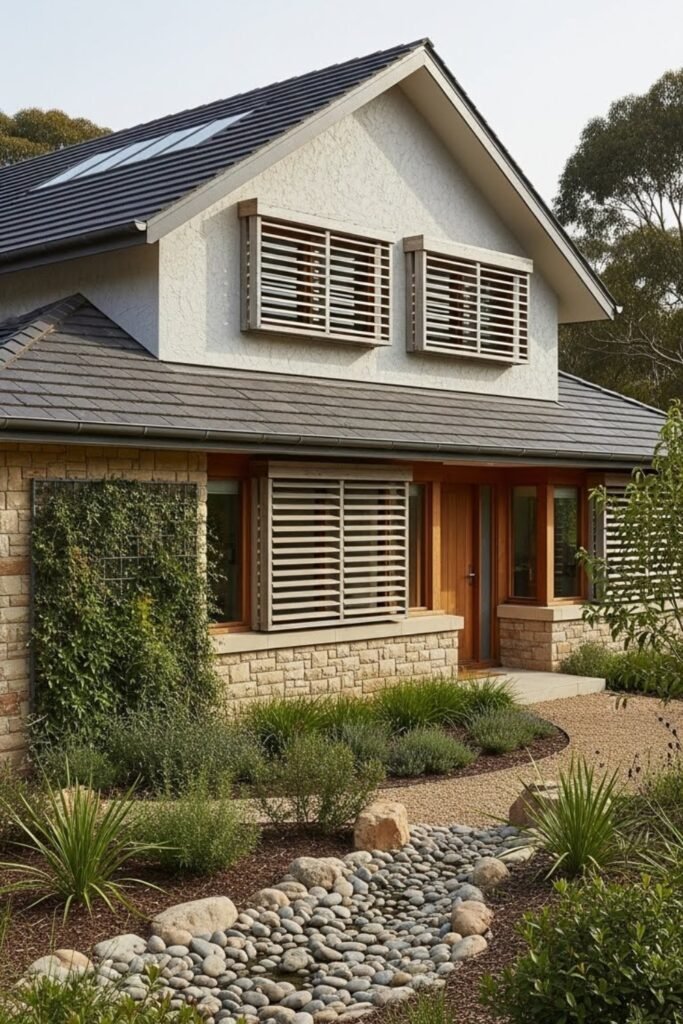 A natural material palette helps regulate temperature and gives the home a calm, earthy feel. This design ages well and requires minimal artificial finishes.