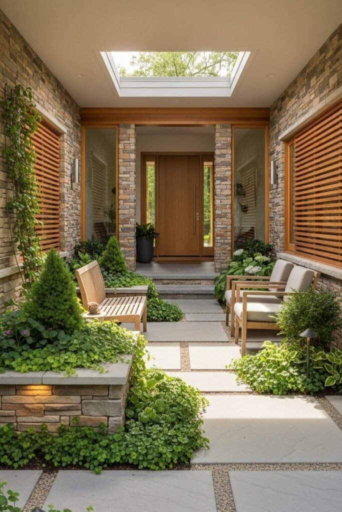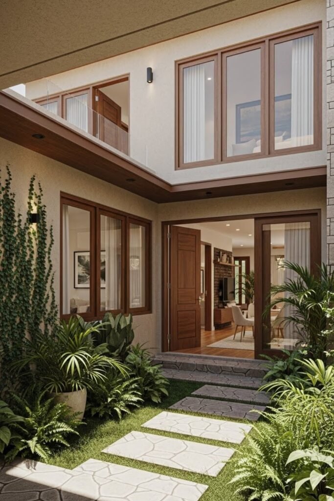 Create a small semi-open courtyard at the entrance for privacy and a welcoming transition. This space separates the home from the street and can include seating, plants, or decorative screens.