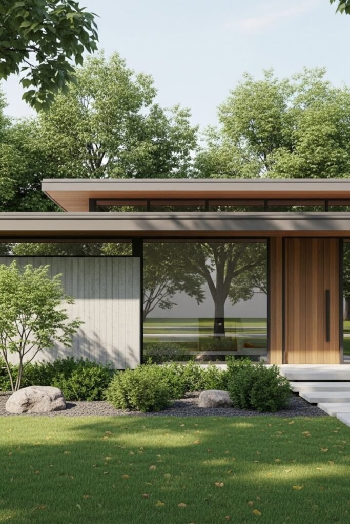 A low-profile roof keeps the bungalow visually grounded and blends smoothly with the surrounding landscape.