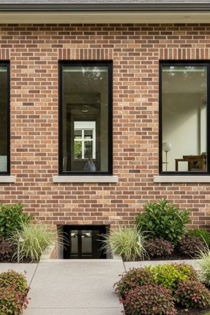 An exposed brick exterior gives the bungalow a strong, timeless look while reducing maintenance. Brick also helps regulate indoor temperature by keeping interiors cooler in summer and warmer in winter.