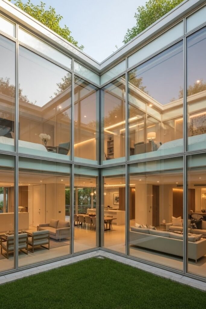 In this layout, the courtyard is fully surrounded by floor-to-ceiling glass walls. Every major room faces the courtyard, allowing constant daylight and uninterrupted views of greenery.