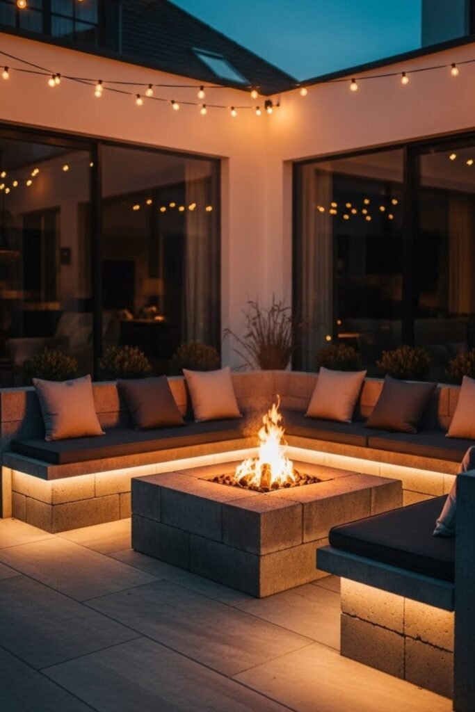 Built-in seating or low walls help contain heat and define the area. This idea suits colder climates or social homes where outdoor relaxation continues after sunset.