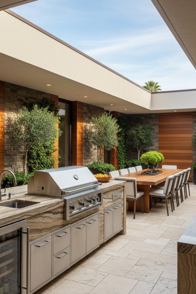 This courtyard is designed around cooking and dining outdoors. A built-in kitchen, prep counter, and dining table turn the courtyard into a daily-use space rather than a visual feature.