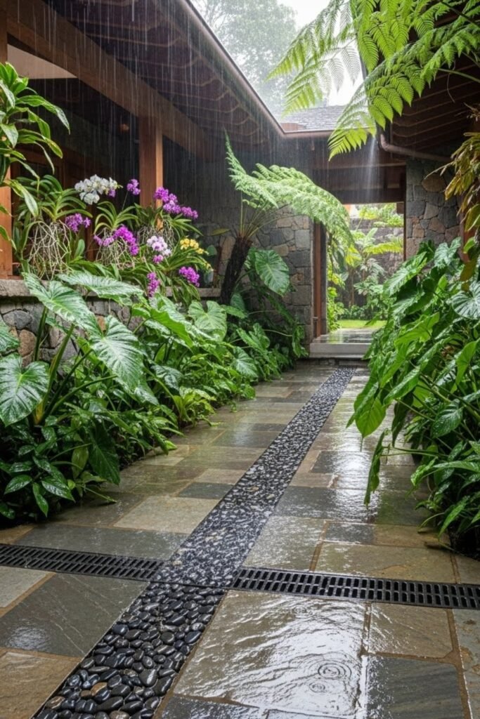 Lush plants thrive naturally, and the sound of rain adds calmness. This idea works well in tropical or monsoon climates where rain becomes part of the living experience.