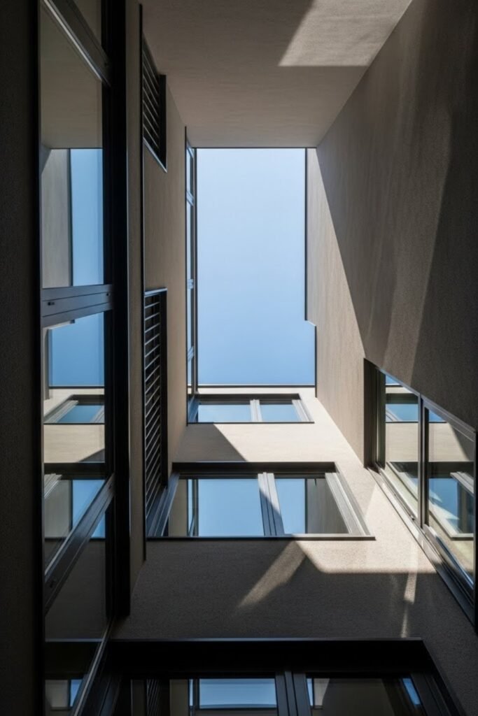 This layout suits dense urban areas where open courtyards aren’t practical but daylight and ventilation are still needed.