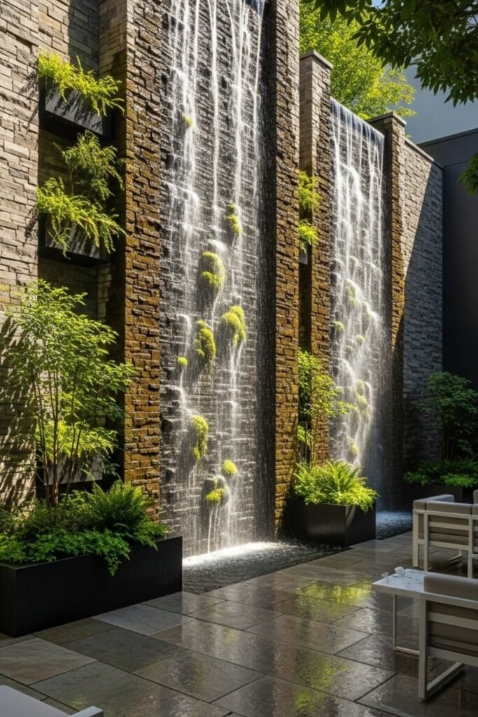 This courtyard features a vertical waterfall built into one wall. Flowing water adds sound, movement, and natural cooling to the space. The wall also becomes a strong visual focal point when viewed from inside rooms.