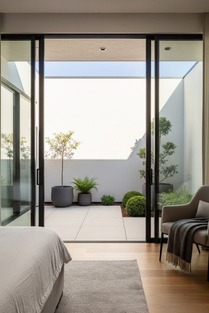 Sliding doors allow fresh air and natural light without sacrificing privacy. This idea suits homes where rest, calm, and personal space are prioritized over entertaining.