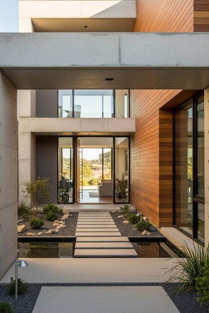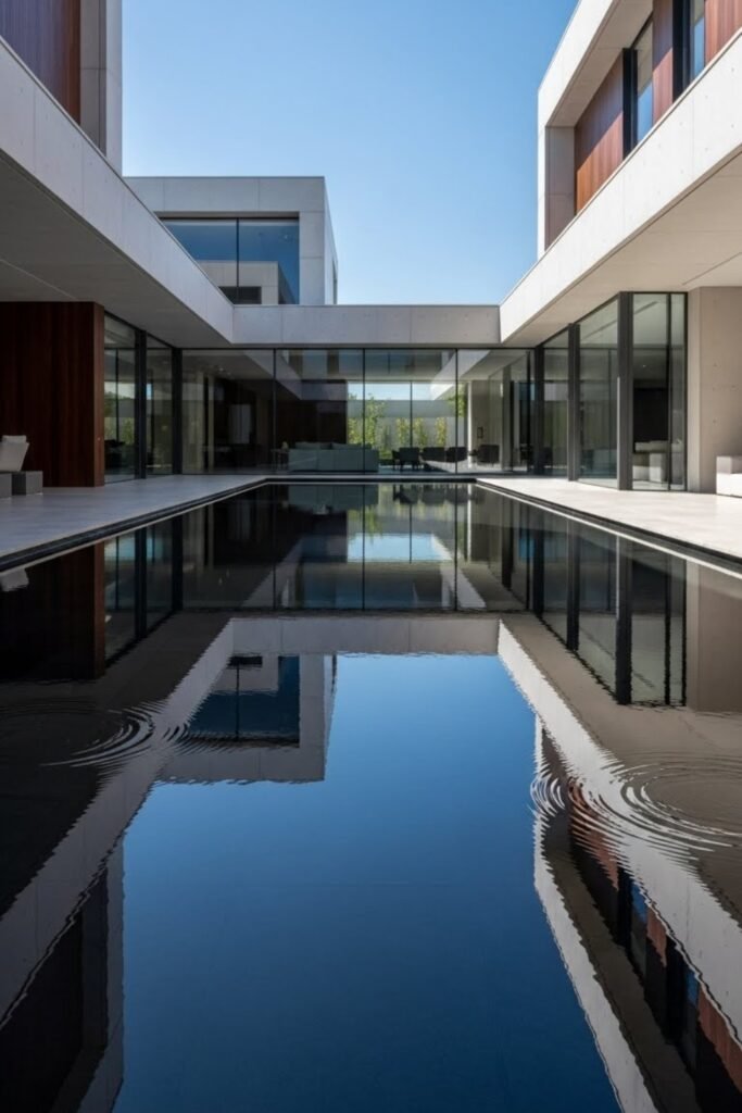 This courtyard features a shallow reflecting pool instead of traditional landscaping. The water mirrors the sky and surrounding walls, adding calmness and visual depth. It also helps cool the house naturally by reducing surrounding heat.