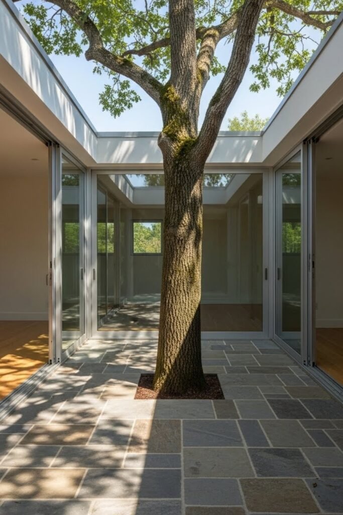 This design creates a strong emotional connection to nature and works beautifully in warm climates. At night, subtle lighting around the tree turns the courtyard into a dramatic visual feature.
