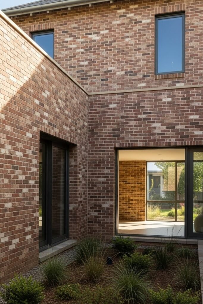This courtyard house uses exposed brick walls to create warmth and texture. Brick helps regulate temperature by staying cool during the day and warm at night.