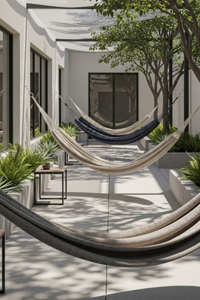 Instead of formal seating, this courtyard is designed for rest and relaxation. Hammocks or swing seating become the main feature, encouraging slow living.