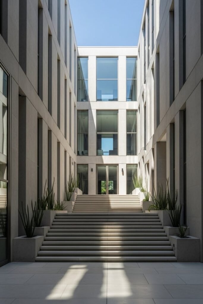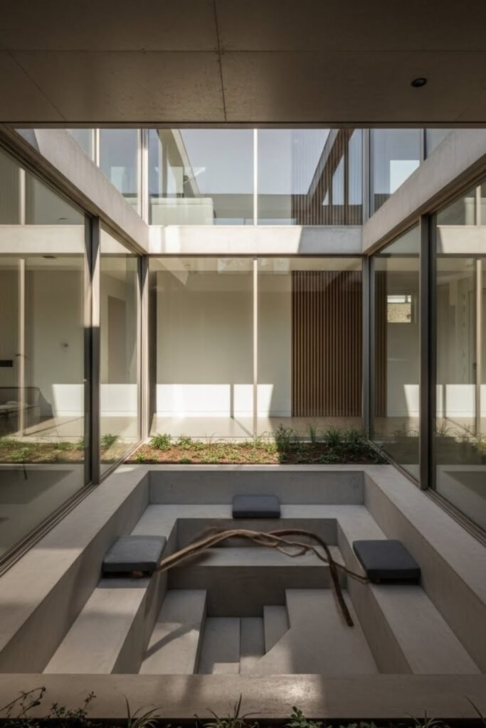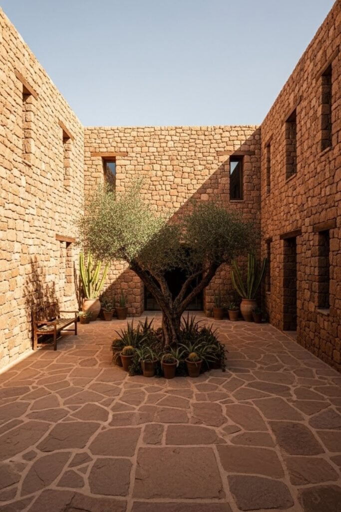 The courtyard may be minimal in decoration, but its function is essential. This idea suits hot climates where passive cooling reduces reliance on mechanical systems