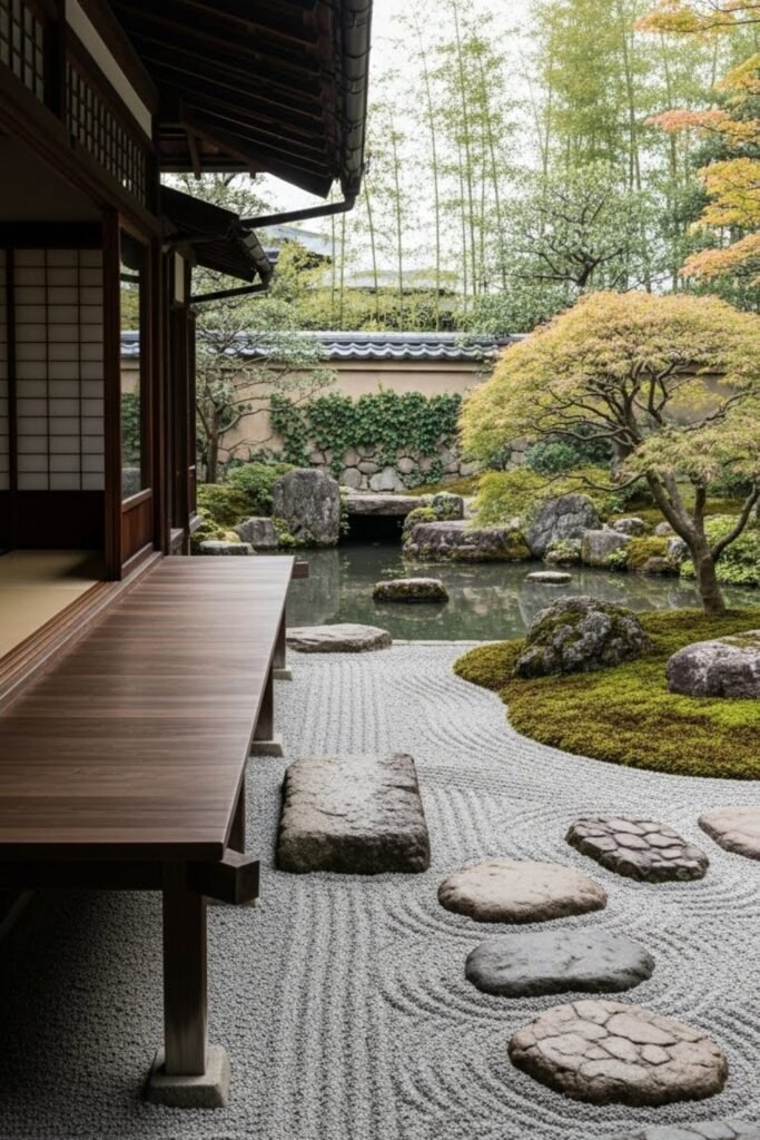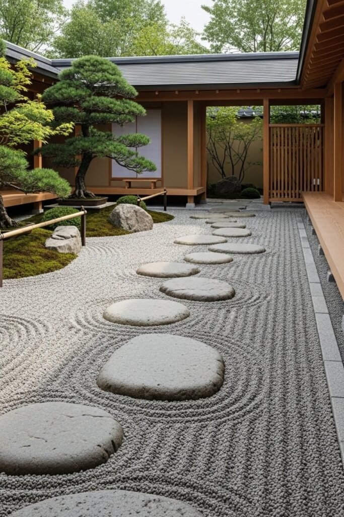 A Zen-style courtyard focuses on balance, simplicity, and calm. Gravel beds, stone slabs, and carefully placed plants replace dense landscaping. The courtyard feels uncluttered and intentional, making it ideal for meditation or quiet reflection.