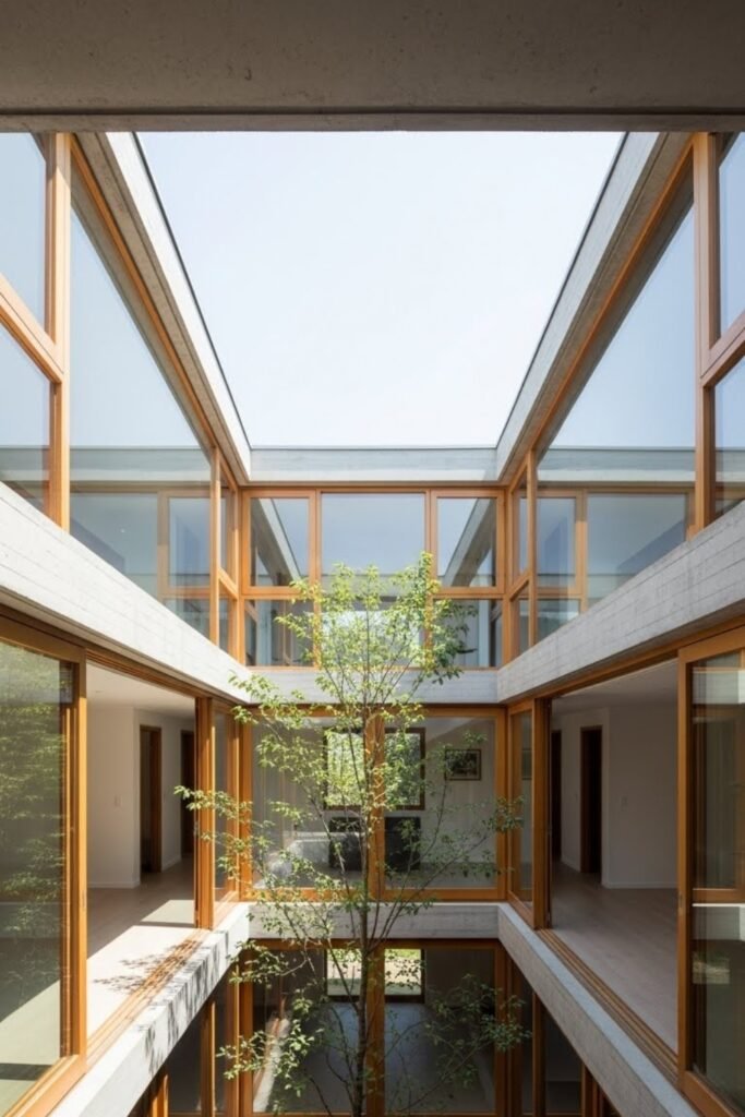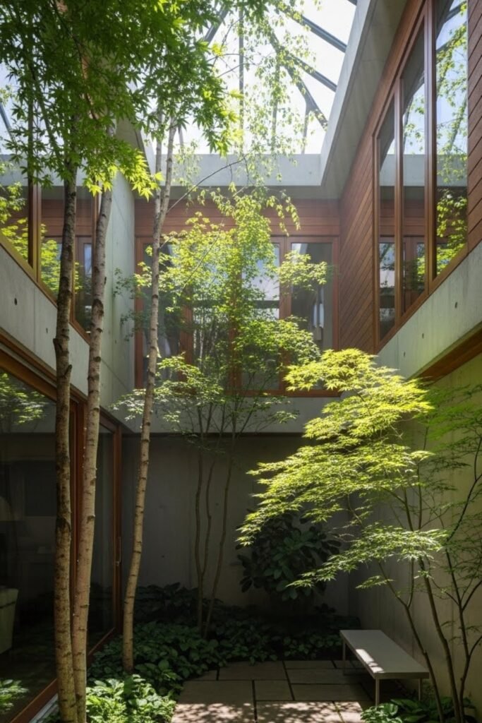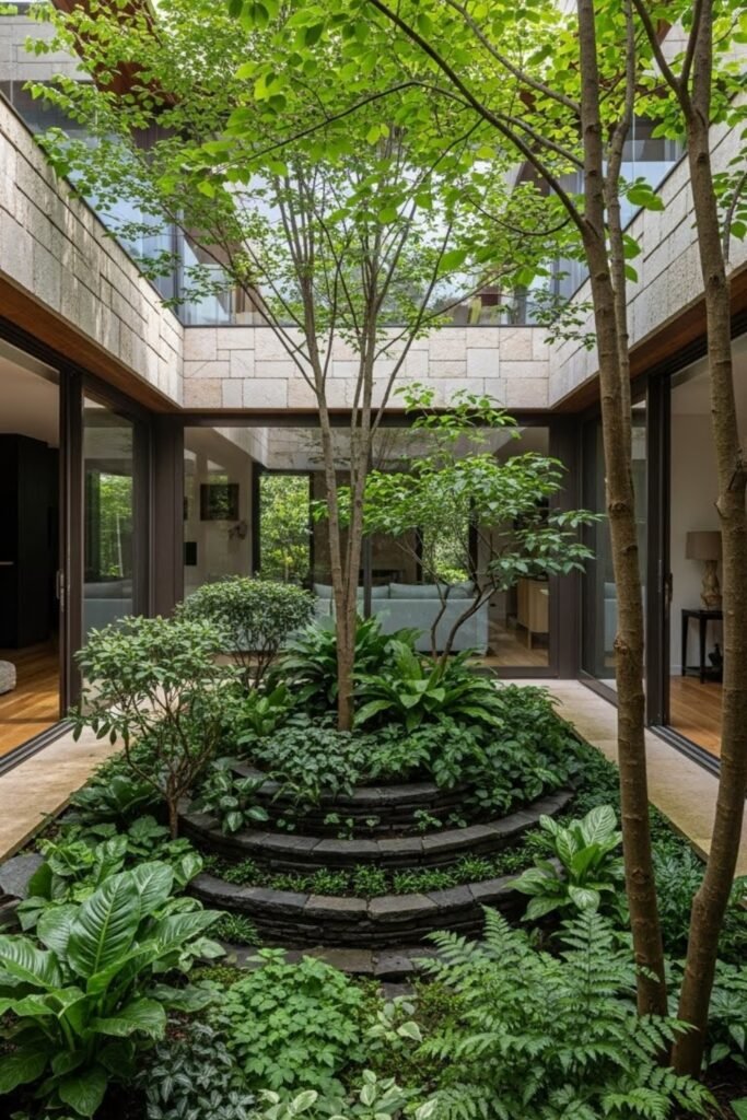Rooms open directly onto this garden, making nature part of everyday life. This layout works well for homes that want a strong connection to plants without a large yard.