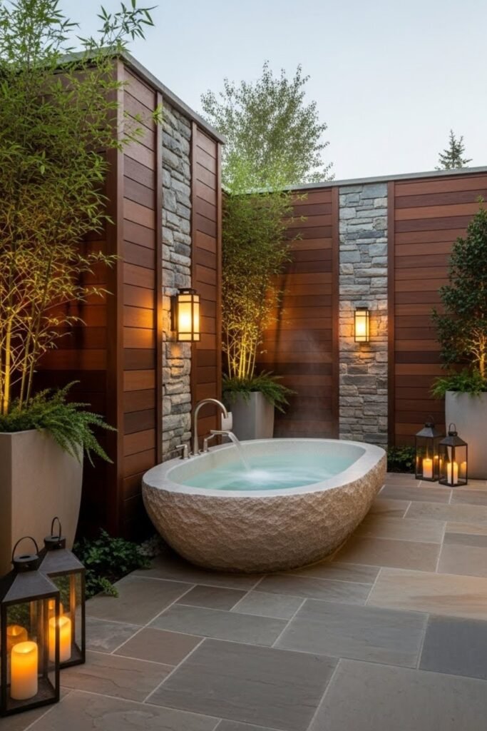 A spa-style courtyard includes an outdoor bath, soaking tub, or relaxation zone. Natural materials and privacy walls create a resort-like feel inside the home.