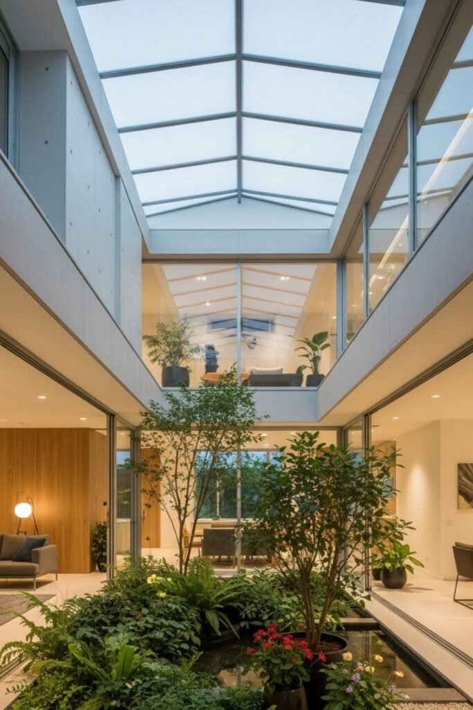 A skylit courtyard sits at the center of the home, protected by a transparent or translucent roof. It allows natural light to reach deep into the house while shielding the space from rain and harsh weather.