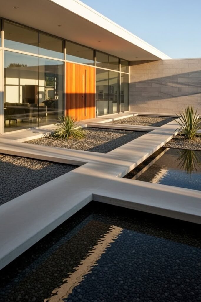 The courtyard feels grounded and timeless, especially when paired with simple plants or wooden accents. This idea works well for both modern and traditional homes looking for a durable, low-maintenance outdoor core.