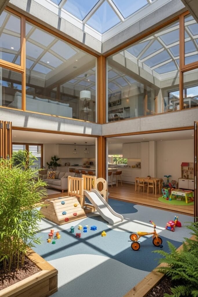 This courtyard is designed as a safe outdoor play area within the home. Enclosed walls provide security while open sightlines let parents supervise easily from inside.