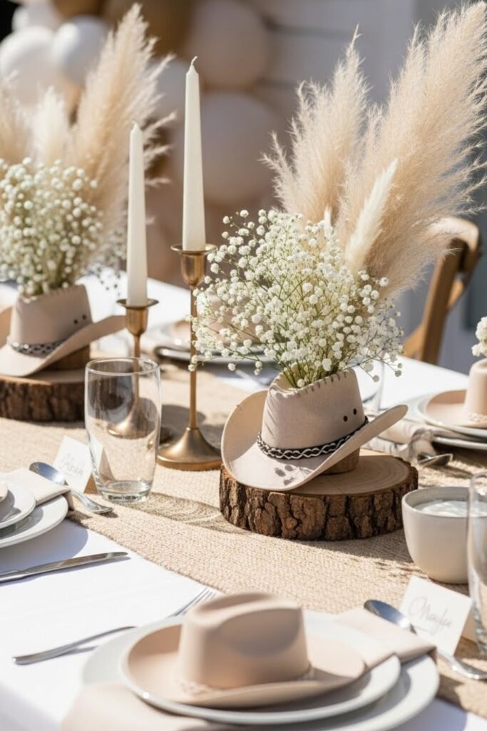Use small cowboy hats as table centerpieces and fill them with faux florals, pampas grass, or cotton stems. Keep colors soft so the tables don’t feel heavy or cluttered.
