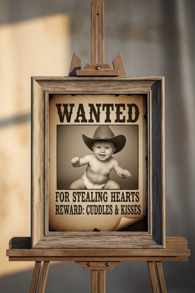 Design a “Wanted: Cute Cowboy” poster featuring the baby’s name, due date, or fun details. Hang it near the entrance or gift table for guests to notice.