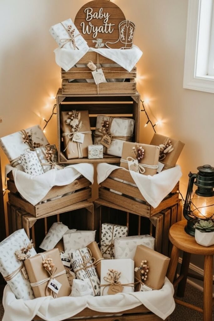 Use stacked wooden crates as a gift display instead of a standard table. Line the inside with soft fabric to keep gifts secure and visually appealing.